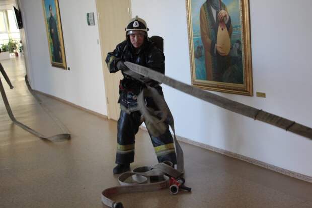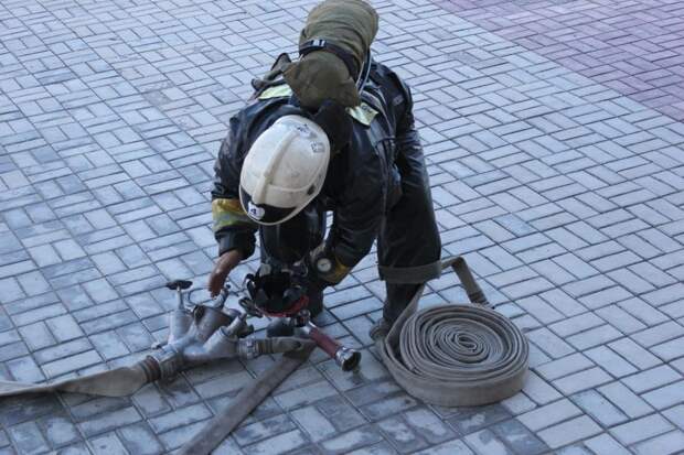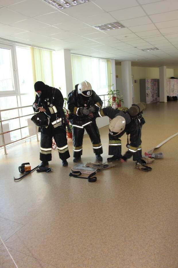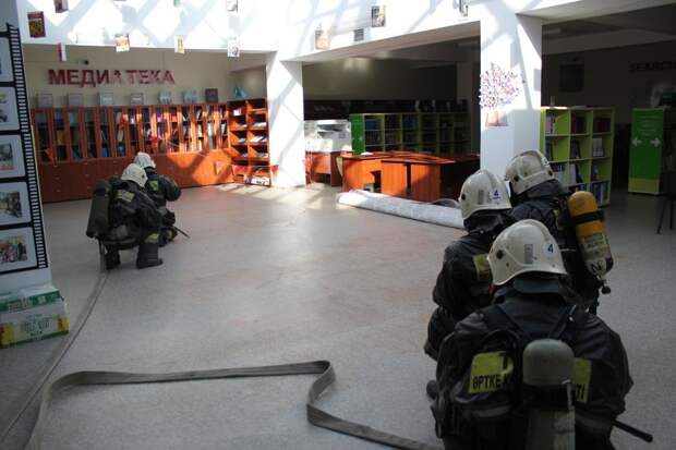 Сообщили о том, что горит библиотека. Прибывшие на место пожарные обнаружили, что из окна второго этажа идет сильный черный дым. Огнеборцы приступили к проведению боевого развертывания, подключившись к аппаратам на сжатом воздухе. В ходе тушение условного пожара эвакуировали 660 человек, из них 630 школьников. Также отработали спасение одного человека. Условный пожар был локализован в 15:42 и ликвидирован шесть минут спустя. В ходе учений пожарные взаимодействовали со специальными и аварийными службами города. В учении задействовали 29 человек личного состава, пять единиц основной и специальной пожарной техники Службы пожаротушения.Ранее городские пожарные отработали действия в гостиничном комплексе.