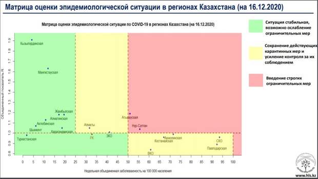 Недельная объединенная заболеваемость превысила 50 случаев на 100 тысяч населения. Объединенный показатель R достиг 1,2.В «красной» зоне наряду с Атырауской областью находится Нур-Султан. В «желтой» зоне: Алматы, Восточно-Казахстанская, Северо-Казахстанская, Акмолинская, Павлодарская, Костанайская и Западно-Казахстанская области. Все остальные регионы находятся в «зеленой» зоне по темпам распространения Covid-19.