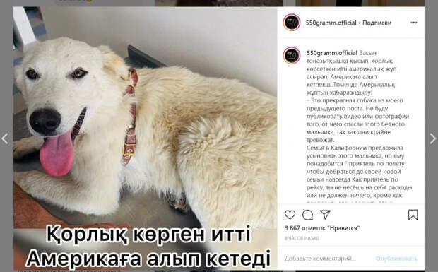 В группе зоозащитников появилась информация о том, что новые хозяева нашлись, однако животному нужен сопровождающий, который собирается в США в ближайшее время."Семья в Калифорнии предложила усыновить этого мальчика, но ему понадобится "приятель по полету", чтобы добраться до своей новой семьи. Будут организованы бумаги и т.д. Если вы отправляетесь в любое ближайшее время, пишите в личку. Не могли бы вы поделиться этим постом с друзьями и коллегами, чтобы мы могли отправить этого мальчика в его новую жизнь", – говорится в сообщении.