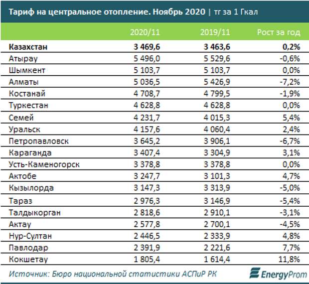 Самый низкий тариф зафиксирован в Кокшетау - 1 800 тенге.За январь–ноябрь 2020 года энергетики обеспечили стране 72 млн Гкал тепловой энергии — на 1,4% меньше, чем годом ранее. В денежном выражении снабжение паром, горячей водой и кондиционированным воздухом составило 234,3 млрд тенге. За полный 2019 год производство теплоэнергии составило 90,1 млн Гкал, сократившись на 4,9% за год. В региональном разрезе больше всего тепловой энергии произвели в Павлодарской области: 12 млн Гкал, минус 6,6% за год. В ТОП-3 регионов также вошли Карагандинская область (10,3 млн Гкал, минус 3,7% за год) и Алматы (7,1 млн Гкал, плюс 7,1%). По информации Казгидромета, ожидаемый зимний период будет сравним с предыдущим годом, то есть будет много осадков, относительно тепло, сообщает официальный ресурс премьер-министра РК. В ближайшее время ожидается осложнение погодных условий с образованием низовой метели, буранами. Подготовительный период к отопительному сезону начат заблаговременно. С августа на учёт взяты более 118 тыс. домовладений частного сектора, где проживают социально уязвимые слои населения. В связи с этим были проведены рейдовые мероприятия по устранению выявленных недостатков газобаллонного и печного оборудования.